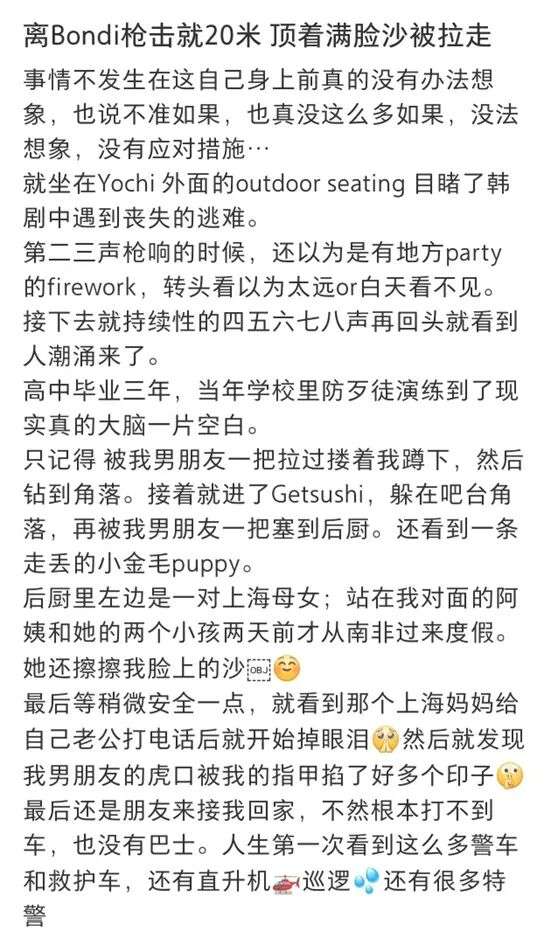 社交平台上,不少华人亲历了这次枪击案件,有人开始听到枪响还以为是在开Party, 后面看到逃窜的人潮才明白事态的严重。
