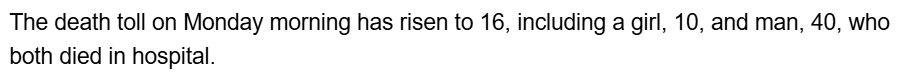 据最新消息,周一上午的死亡人数上升至16人,其中包括一名10岁女孩和一名40岁男子,两人均在医院去世。