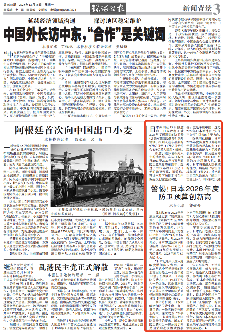 日本共同社13日报道称,日本政府正就2026年度预算案的防卫费(含美军整编经费等)展开协调,拟列入迄今最多的9万亿日元(1万亿日元约合453亿元人民币)规模。
