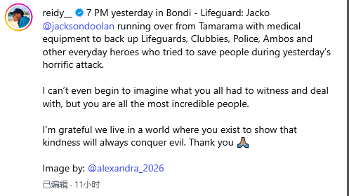 配文如下:昨天晚上7点的Bondi,救生员:Jacko(@jacksondoolan)带着医疗设备从Tamarama海滩跑过来,支援救生员、俱乐部工作人员、警察、急救人员以及其他在昨天那场可怕的袭击中试图拯救人们的普通的英雄。
