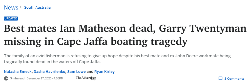 死者Matheson的伴侣Helen Wade在社交媒体上发帖称:“这是我说过的最难的话——我亲爱的丈夫Matho在Cape Jaffa乘船外出时遭遇意外不幸去世,他的好友Garry和我们的狗Archer仍然失踪。我没想到今早和你通话竟是最后一次。”