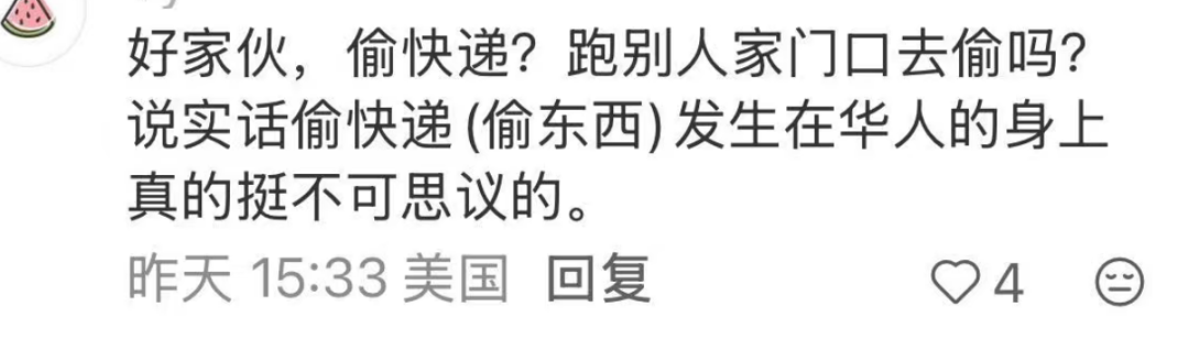 “好家伙,偷快递?跑别人家门口去偷吗?说实话偷快递(偷东西)发生在华人的身上真的挺不可思议的。”