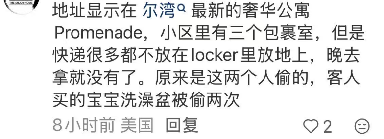 “两人偷窃的地址显示在尔湾最新的奢华公寓,小区里有三个包裹室,但是快递很多都不放在locker里放地上,晚去拿就没有了。原来是这两个人偷的,客人买的宝宝洗澡盆被偷两次。”