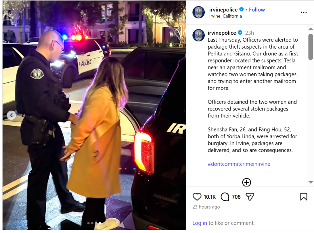 尔湾警方强调,包裹盗窃仍然是严重的犯罪行为,并着重介绍了目前警方可以使用包括无人机在内的科技手段,帮助快速定位嫌疑人。