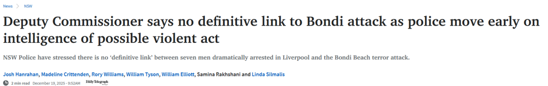 只是新州警方并未就这一问题给出官方解释,已知的消息是:这7名男子与Bondi恐袭枪手之间不存在直接联系。