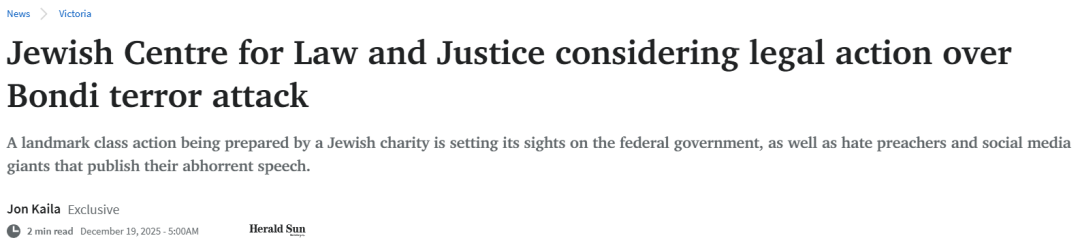 还有消息指出,Jewish Centre For Law and Justice(JCLJ)律所表示,准备发起一项里程碑式的集体诉讼——针对目标是澳洲联邦政府、澳洲情报部门、联邦警察和新州警方!