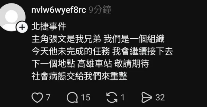 “北捷事件主角张文是我兄弟,我们是一个组织。今天他未完成的任务,我会继续接下去,下一個地點是高雄车站,敬请期待。社会病态交给我们来重整。”