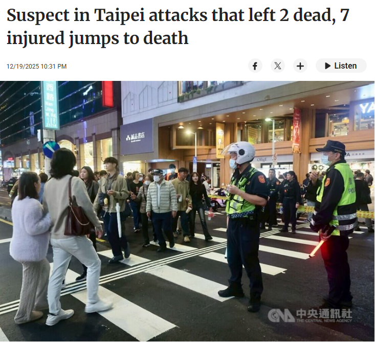 2025年12月19日,台北市最繁忙的交通与商业核心地带接连发生纵火、投掷烟雾弹及随机持刀伤人事件。