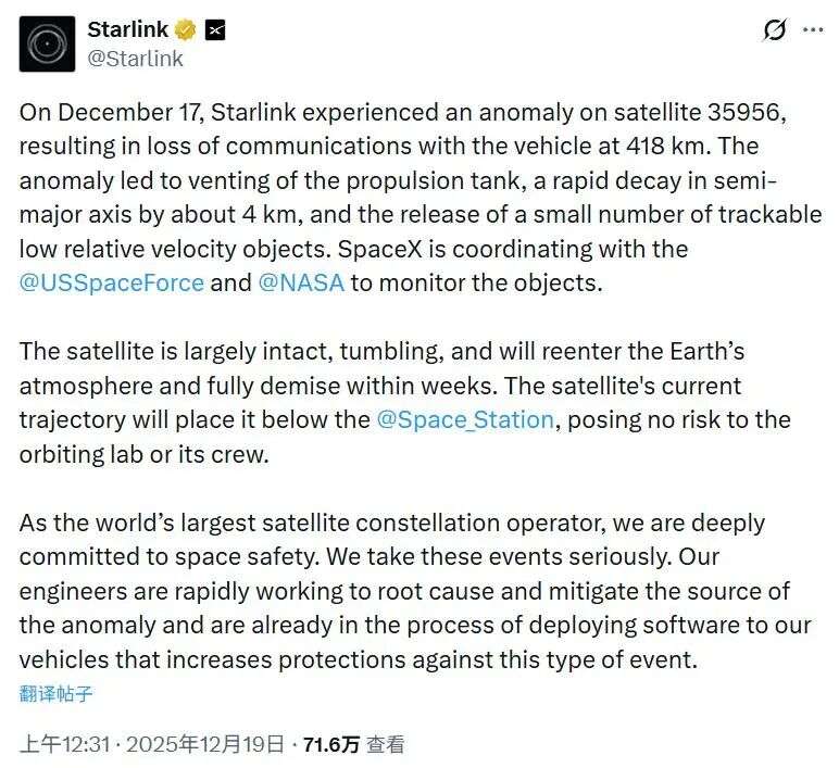 据参考消息援引路透社12月19日报道,美国太空探索技术公司(SpaceX)旗下“星链”计划表示,其一颗卫星17日在太空发生异常,产生了“少量”碎片,并在418公里的高度与地面失去通信联系,这是这家卫星互联网巨头在轨道上发生的罕见动力事故。