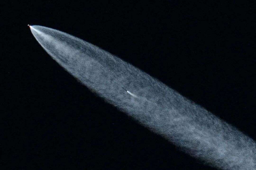 在美国加利福尼亚州朗代尔拍摄的照片显示,搭载着“星链”卫星的“猎鹰9”火箭从范登堡太空军基地发射升空。图片来源:参考消息(法新社资料图片)