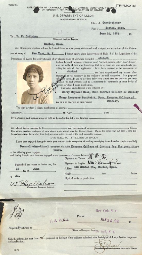 美国档案显示:萧蕙裳是1917年8月24日乘Siberia Maru邮轮抵达旧金山,8月28日批准入境。