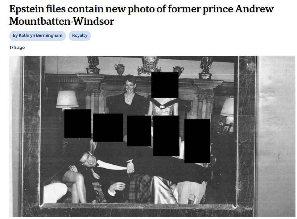 在卷入爱泼斯坦案后,安德鲁如今已被英国王室剥夺全部王室头衔。在涉案照片中,他侧躺在5名面部被遮盖的女子腿上,而爱泼斯坦的前女友马克斯韦尔(Ghislaine Maxwell)则在后方,低头笑看安德鲁。在她身旁也站着一名神秘女子。