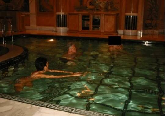 克林顿与爱泼斯坦前女友季丝兰·麦斯威尔(Ghislaine Maxwell)在泳池戏水的照片。