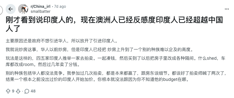 “刚才看到说印度人的,现在澳洲人已经反感度印度人已经超越中国人了。”