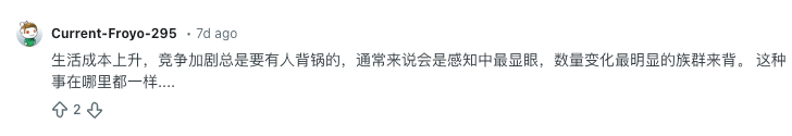 “生活成本上升,竞争加剧总是要有人背锅的,通常来说会是感知中最显眼,数量变化最明显的族群来背。这种事在哪里都一样……”