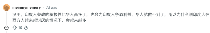 “没用,印度人参政的积极性比华人高多了,也会为印度人争取利益,华人就做不到了。”