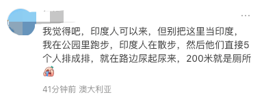 “我觉得吧,印度人可以来,但别把这里当印度。我在公园里跑步,印度人在散步,然后他们直接5个人排成排,就在路边尿起尿来,200米就是厕所。”