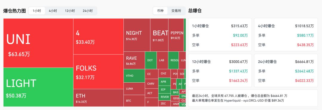 北京时间20日晚间,仍在交易的加密货币集体拉升,纷纷飘红,21日上午又集体跳水。CoinGlass数据显示,截至发稿,近24小时内,加密货币共有超6.7万人爆仓。