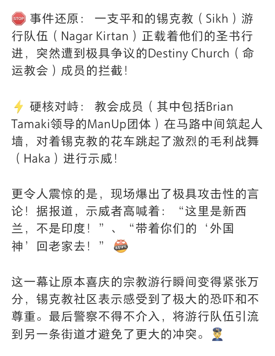 现场爆出了极具攻击性的言论,据报道,示威者高喊着:“这里是新西兰,不是印度!”、“带着你们的‘外国神’回老家去!”