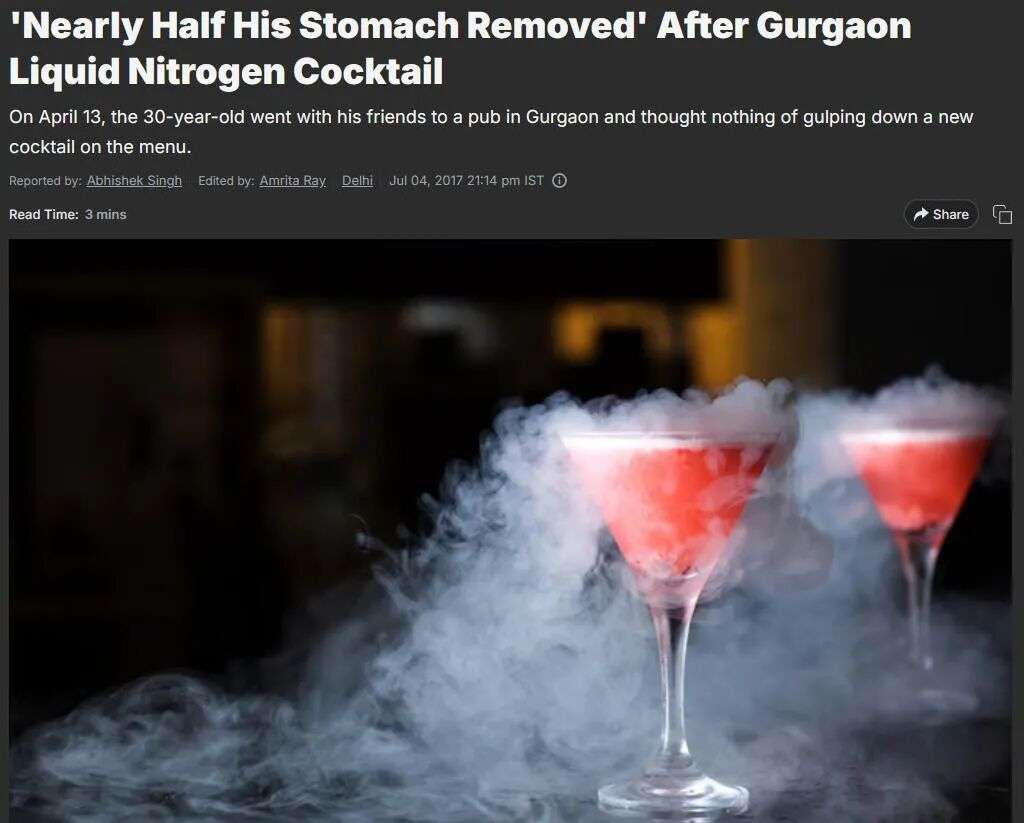 在古尔冈(新德里附近一座城市),一位30岁男子在酒吧点了一杯加了液氮的鸡尾酒,在液氮散去之前,他就火急火燎地开喝了。