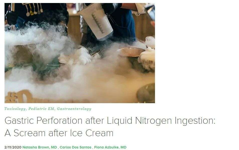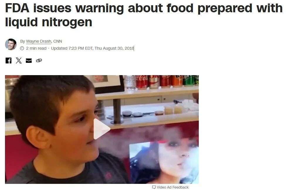 其实早在2018年,美国食品药品监督管理局(FDA)就发布过安全警报,称食用液氮制作的冰淇淋、麦片或鸡尾酒可能会导致严重伤害: