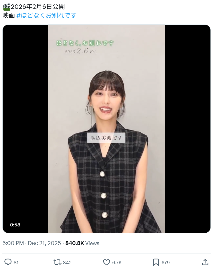 近日,电影《不久,就要告别了》官方账号一段主演问候视频,视频中,与记忆中不太一样的“滨边美波”引发了日本网友热议。与此同时,“滨边美波长相”相关的讨论帖,也在短时间内吸引了千万网友围观。