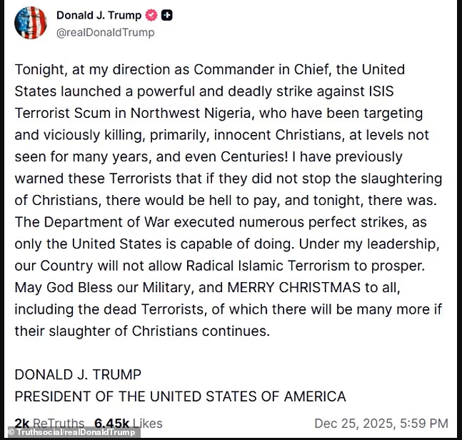 “今晚,在我作为三军统帅的指示下,美国对尼日利亚西北部的ISIS恐怖分子发动了强力且致命的打击。他们长期针对、残忍屠杀无辜民众,尤其是基督徒,其程度在许多年、甚至几个世纪里都极为罕见。”
