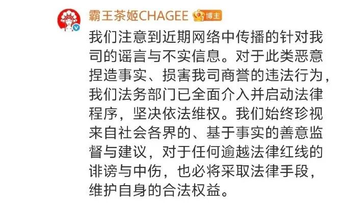 据钱江视频报道,霸王茶姬官博26日下午在评论区回复称:我们注意到近期网络中传播的针对我司的谣言与不实信息。对于此类恶意捏造事实、损害我司商誉的违法行为,我们法务部门已全面介入并启动法律程序,坚决依法维权。我们始终珍视来自社会各界的、基于事实的善意监督与建议,对于任何逾越法律红线的诽谤与中伤,也必将采取法律手段,维护自身的合法权益。