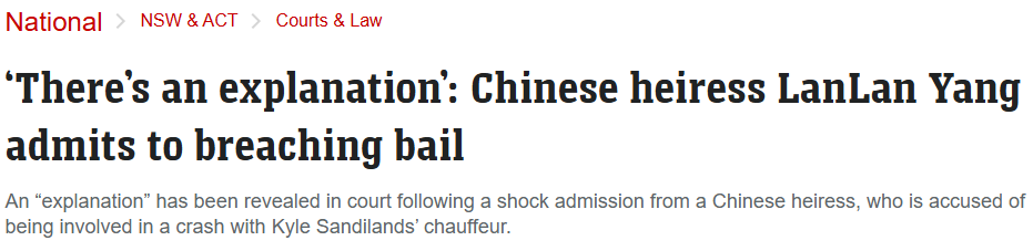 近日,被控涉嫌与电台主持人凯尔·桑迪兰德斯司机发生碰撞的华裔富家女杨兰兰,在法庭上意外承认违反保释条件。