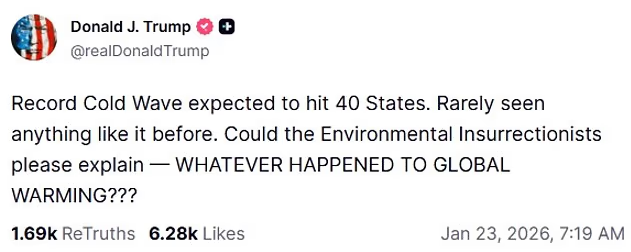 总统川普(Donald Trump)在Truth Social上发文,嘲讽气候变化专家:“很少见到这么冷的天气。所谓的全球变暖去哪了?”该言论再度引发气候变化与政治立场的争论。