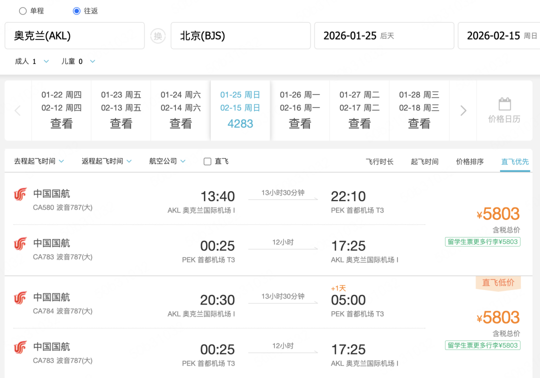 国航周四在其社交平台表示,将在1月24日至3月2日期间,奥克兰直飞北京的航班由目前的每周7班增加到10班——座位增加42%。