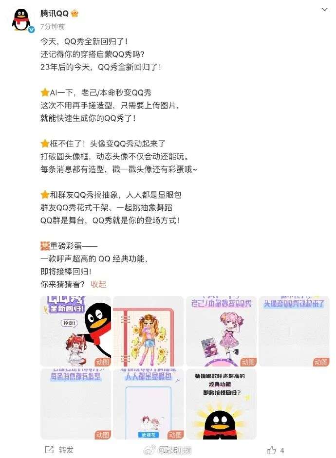 收藏刚刚,QQ秀全新回归了:可以使用AI驱动生成专属形象;QQ头像可以变成动态QQ秀的小人