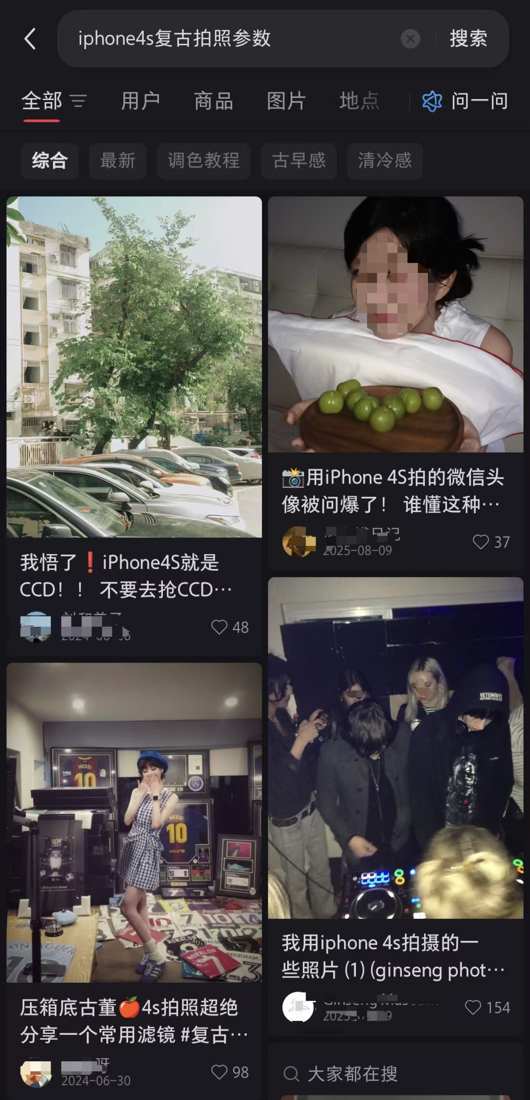 还有网友表示,iPhone 4S相机拍出的颗粒感照片符合“复古潮流”,效果“神似”CCD相机:在社交平台搜索关键词可以看到,有众多 “iPhone 4S 复古拍照教程”的贴文。