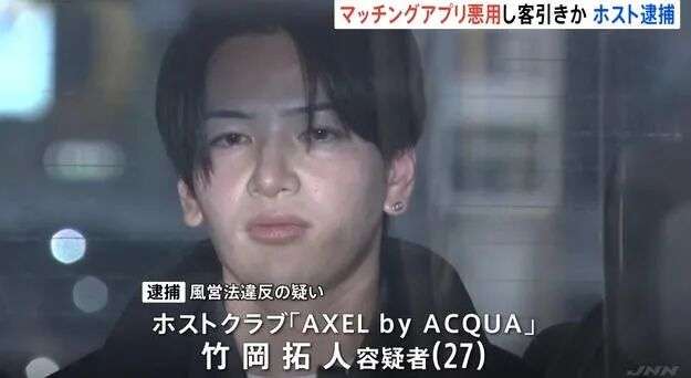 竹冈拓人因非法拉客,涉嫌违反《风俗营业法》,遭日本警视厅逮捕,成为日本首例通过交友APP进行非法拉客的案例。