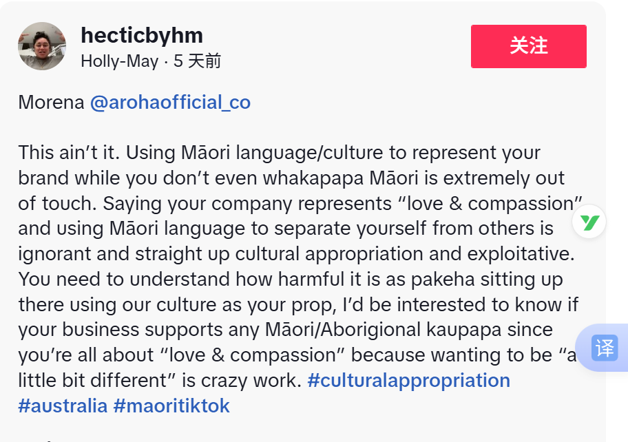 事情的起因,是Aroha品牌创始人Katie Bourke在一段社交媒体视频中解释,自己为什么会选择一个毛利语词汇,来作为品牌名字。