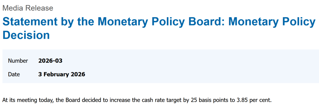 澳洲储行今天下午官宣将基准利率上调25个基点,至3.85%。