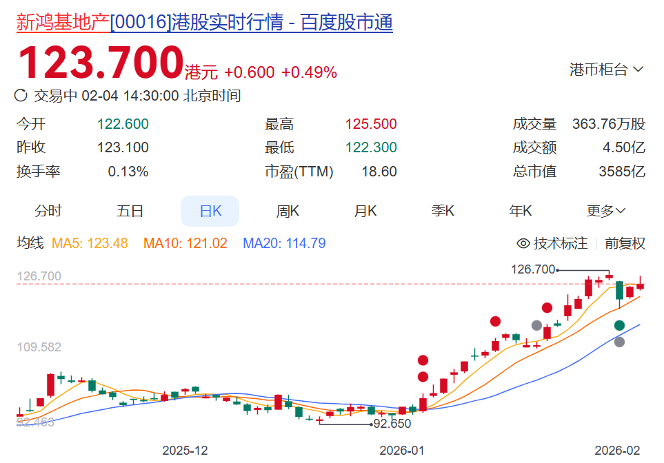 近期,新鸿基地产股价持续上涨,截至发稿报123.7港元,总市值3585亿港元(约合人民币3179亿元)。