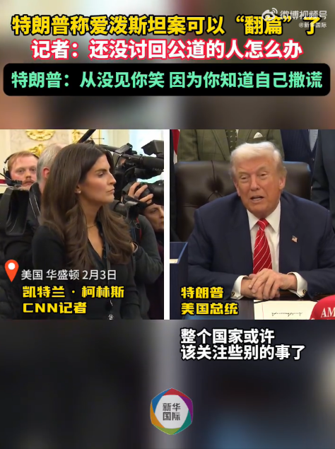 2月4日,据新华国际消息,当地时间3日,美国总统特朗普在回答美国有线电视新闻网(CNN)女记者凯特兰·柯林斯有关爱泼斯坦案的提问时称,现在该去关注其他事情。