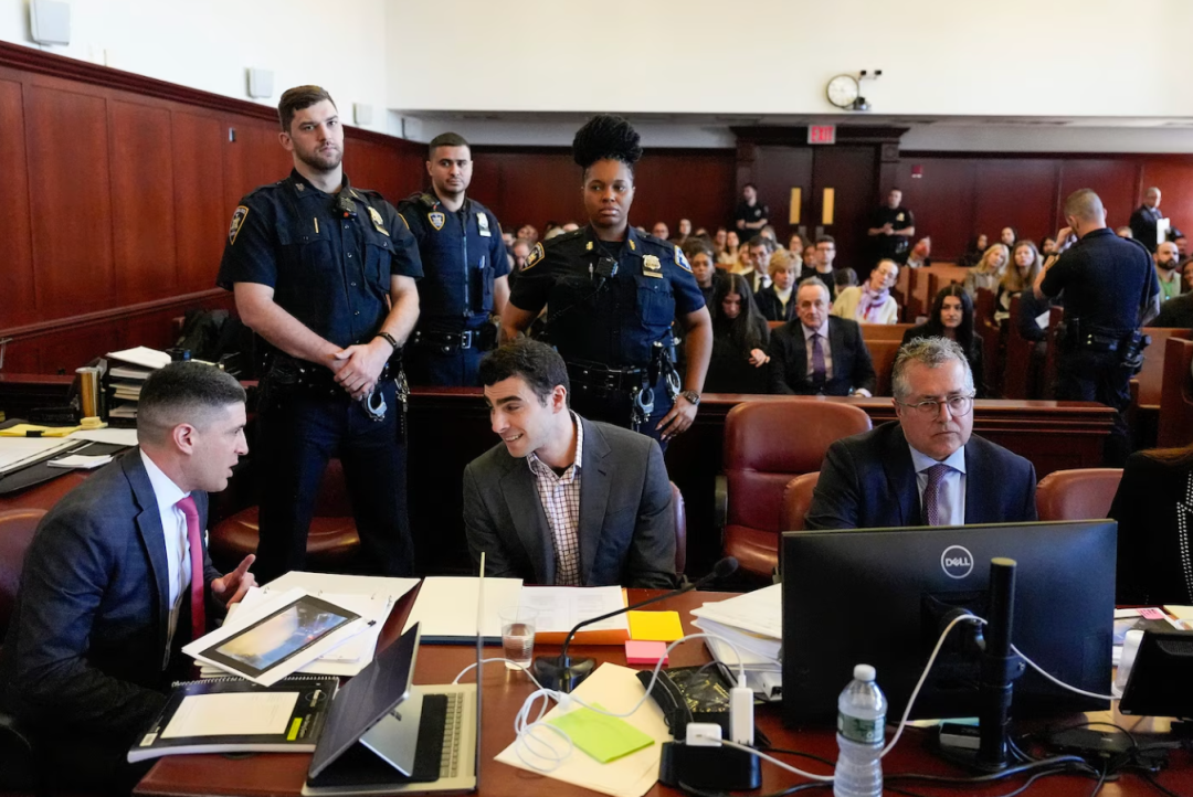 ▲路易吉·曼吉奥内(中)于2025年12月1日在纽约市曼哈顿刑事法庭出庭