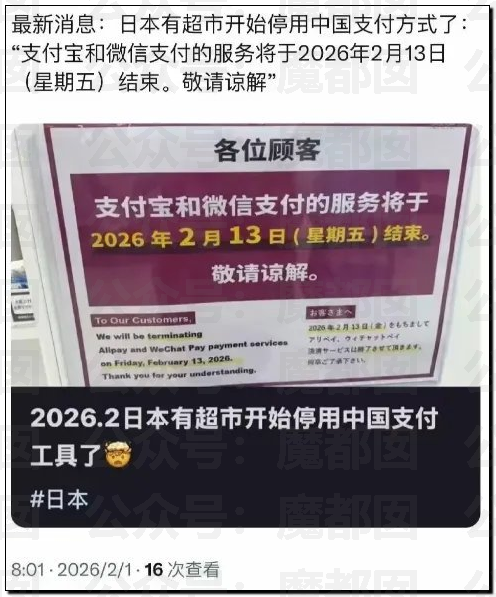 顺便带点老妖婆的事情,现在小日子是越来越离谱,居然主动和中国商业支付脱钩了!部分日本超市发通告表示从2月13日起停用支付宝微信。