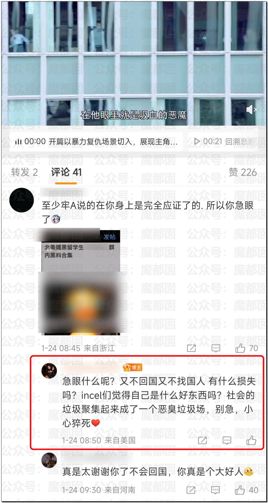 为何会去攻击这位女留子?因为她在网上骂牢A,于是被很多国内网友攻击,这位弟弟也是其中一员。