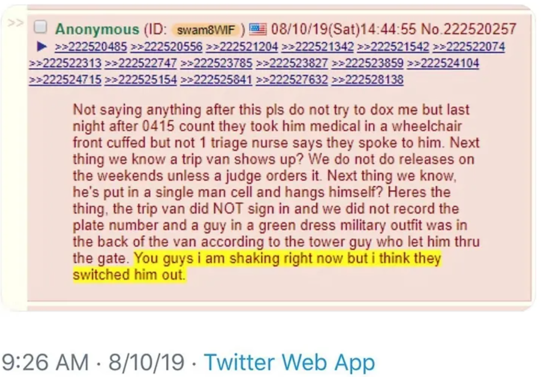 2019年8月10日爱泼斯坦离世当天,有人匿名发帖称,前一晚目睹他被锁在医疗轮椅上离开牢房,并有未经许可的车辆驶入监狱,暗指其并非自杀,而是被“调包转移”。
