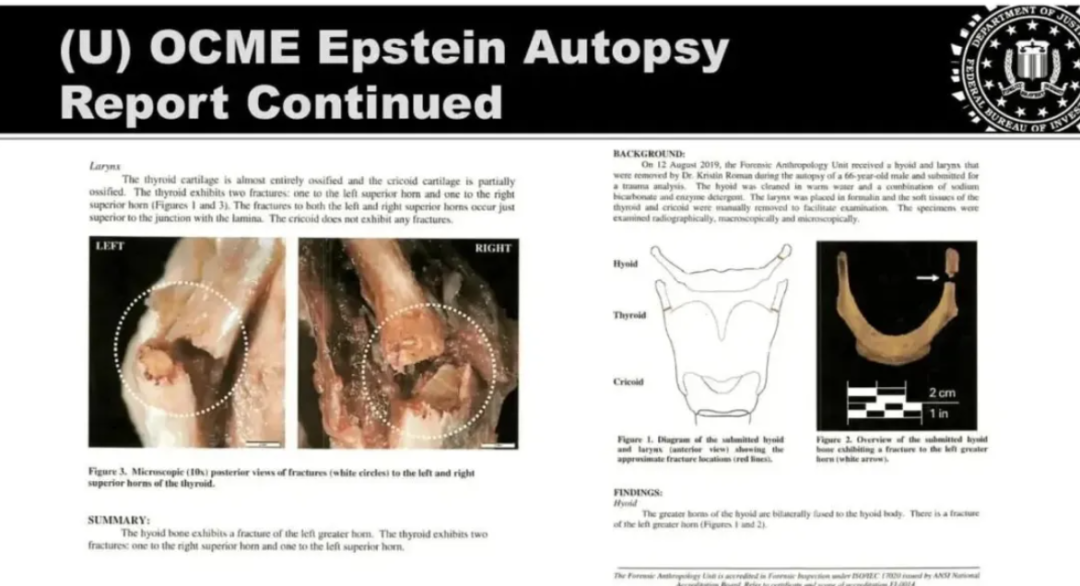 此外,照片中可见颈部甲状软骨出现两处严重骨折,一些网友认为,这种伤势更符合他杀特征。
