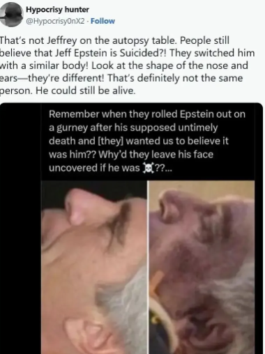 有人声称,尸检照片中死者的鼻型、耳廓、甚至纹身位置,与爱泼斯坦生前影像“不完全一致”。
