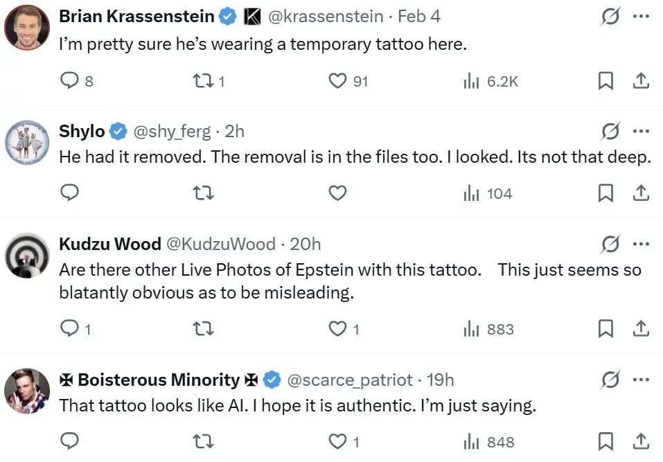 “还有没有其他显示爱泼斯坦有这个纹身的实况照片?这看起来明显得有点像是在刻意误导。”