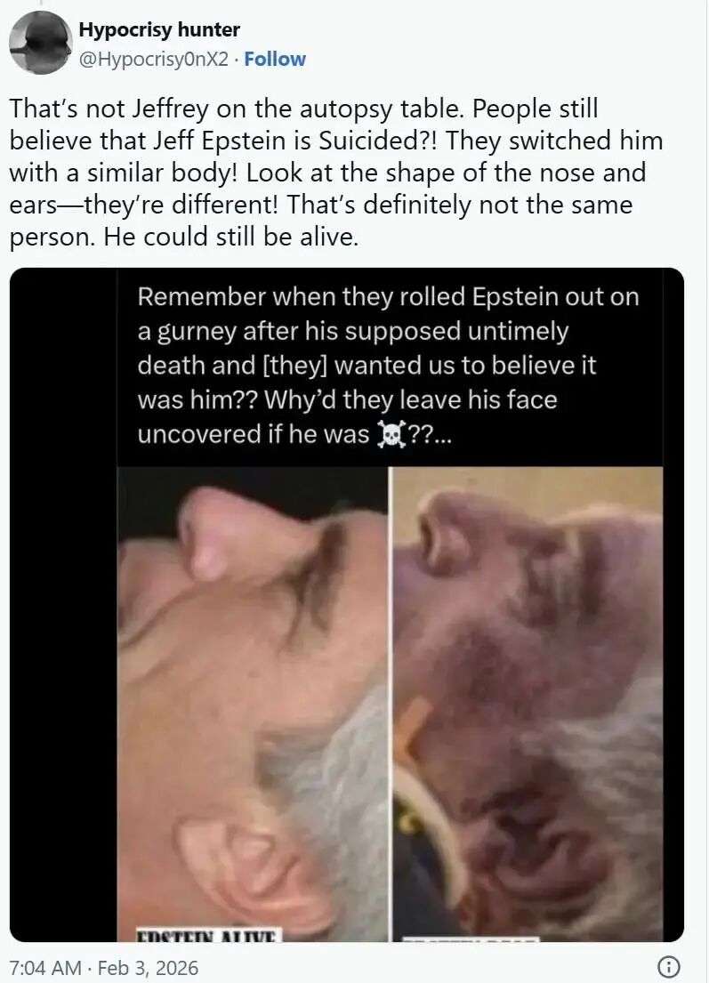 然而,当显微镜对准这些证据时,一部分网友却产生了一个怀疑:照片中那个死者,怎么和爱泼斯坦本人的特征……对不上?
