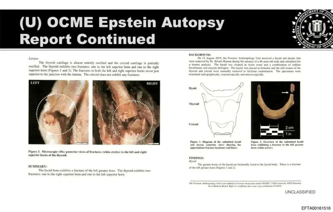 还有一些照片清晰地记录了爱泼斯坦颈部两处极深的甲状软骨骨折。