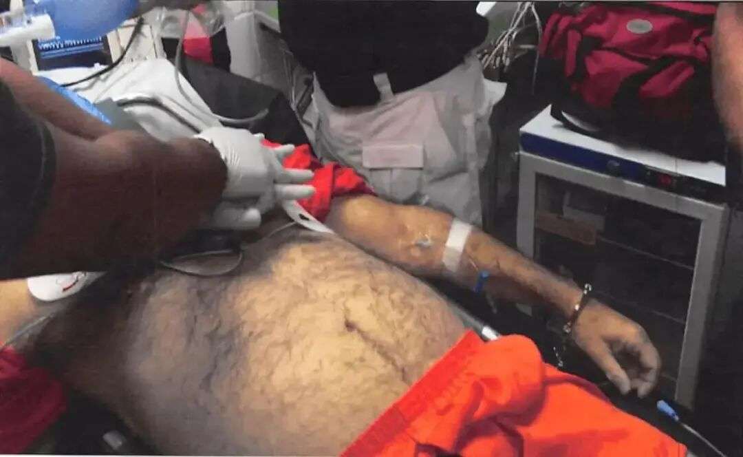 图片显示,急救人员和狱警在发现爱泼斯坦失去反应后对其进行救治。