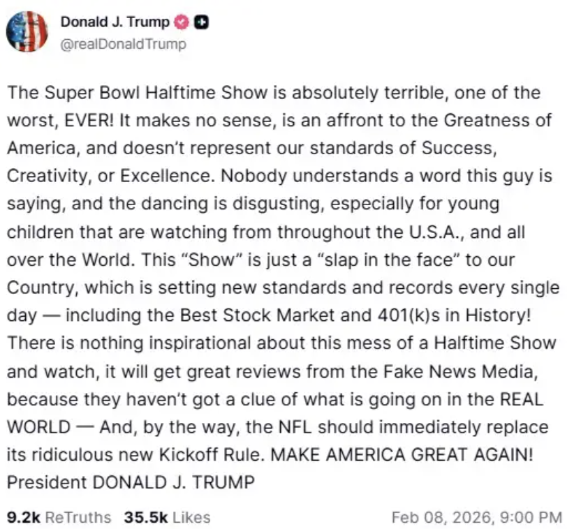 “超级碗中场秀简直糟糕透顶,是史上最差之一,太差了!完全说不通,是对美国伟大精神的冒犯,也完全不代表我们对成功、创造力和卓越的标准。没人听得懂这个家伙在唱什么,那些舞蹈也令人作呕,尤其是对全美乃至全世界正在观看的年轻孩子来说。”