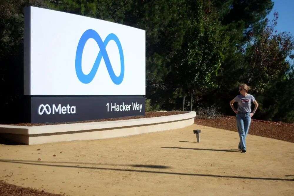 2021年10月29日,在美国旧金山湾区,一名女子站在“元”标志牌前。新华社记者吴晓凌摄